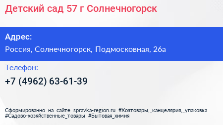 Детский сад №57, г. Солнечногорск по адресу Детский сад № 57 «Золотой ключик», Аллея Славы Тимоново, Солнечногорск-7, Тимоново, городской округ Солнечногорск, Московская область, Центральный федеральный округ, 141502, Россия в дальнейшем Организация, размещена в следующих категориях: