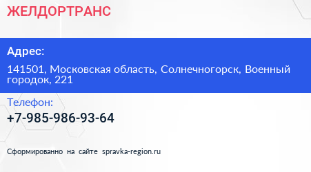 ЖЕЛДОРТРАНС по адресу 141501, Московская область, Солнечногорск, Военный городок, 221 в дальнейшем Организация, размещена в следующих категориях: