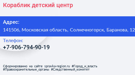 Кораблик, детский центр по адресу 141506, Московская область, Солнечногорск, Баранова, 12 в дальнейшем Организация, размещена в следующих категориях: