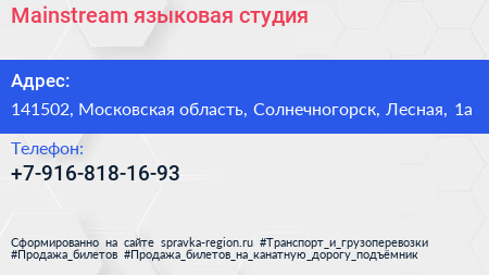 Mainstream, языковая студия по адресу 141502, Московская область, Солнечногорск, Лесная, 1а в дальнейшем Организация, размещена в следующих категориях:
