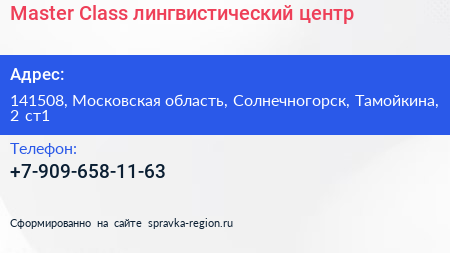 Master Class, лингвистический центр по адресу 141508, Московская область, Солнечногорск, Тамойкина, 2 ст1 в дальнейшем Организация, размещена в следующих категориях: