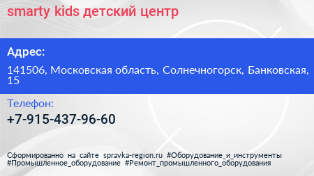 smarty kids, детский центр по адресу 141506, Московская область, Солнечногорск, Банковская, 15 в дальнейшем Организация, размещена в следующих категориях: