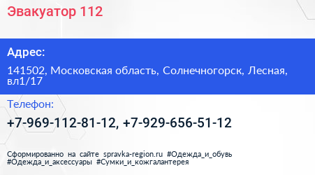 Эвакуатор 112 по адресу 141502, Московская область, Солнечногорск, Лесная, вл1/17 в дальнейшем Организация, размещена в следующих категориях: