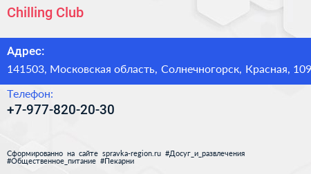 Chilling Club по адресу 141503, Московская область, Солнечногорск, Красная, 109 в дальнейшем Организация, размещена в следующих категориях: