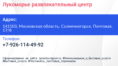 Лукоморье, развлекательный центр по адресу 141503, Московская область, Солнечногорск, Почтовая, 17/8 в дальнейшем Организация, размещена в следующих категориях: