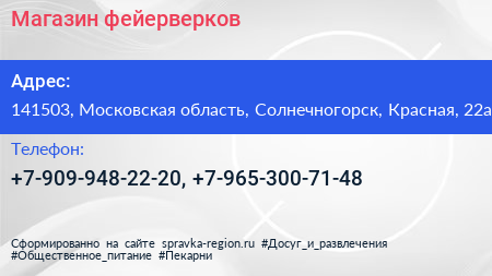 Магазин фейерверков по адресу 141503, Московская область, Солнечногорск, Красная, 22а в дальнейшем Организация, размещена в следующих категориях: