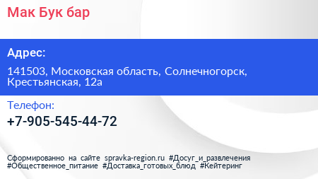 Мак & Бук, бар по адресу 141503, Московская область, Солнечногорск, Крестьянская, 12а в дальнейшем Организация, размещена в следующих категориях: