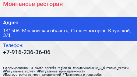 Монпансье, ресторан по адресу 141506, Московская область, Солнечногорск, Крупской, 3/1 в дальнейшем Организация, размещена в следующих категориях: