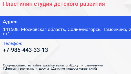 Пластилин, студия детского развития по адресу 141508, Московская область, Солнечногорск, Тамойкина, 2 ст1 в дальнейшем Организация, размещена в следующих категориях: