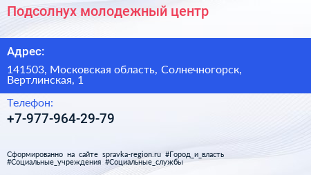 Подсолнух, молодежный центр по адресу 141503, Московская область, Солнечногорск, Вертлинская, 1 в дальнейшем Организация, размещена в следующих категориях: