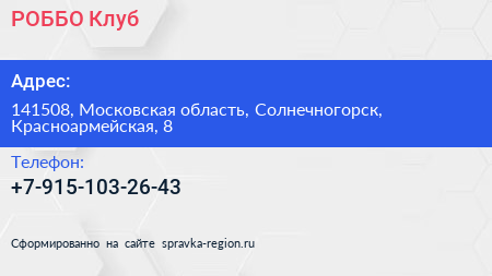 РОББО Клуб по адресу 141508, Московская область, Солнечногорск, Красноармейская, 8 в дальнейшем Организация, размещена в следующих категориях: