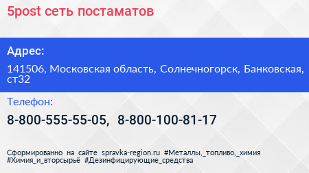 5post, сеть постаматов по адресу 141506, Московская область, Солнечногорск, Банковская, ст32 в дальнейшем Организация, размещена в следующих категориях: