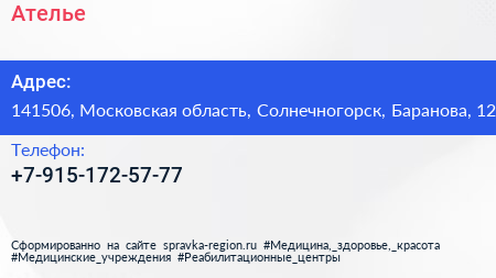 Ателье по адресу 141506, Московская область, Солнечногорск, Баранова, 12 в дальнейшем Организация, размещена в следующих категориях: