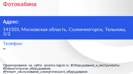 Фотокабина по адресу 141503, Московская область, Солнечногорск, Тельнова, 3/2 в дальнейшем Организация, размещена в следующих категориях: