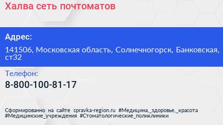 Халва, сеть почтоматов по адресу 141506, Московская область, Солнечногорск, Банковская, ст32 в дальнейшем Организация, размещена в следующих категориях:
