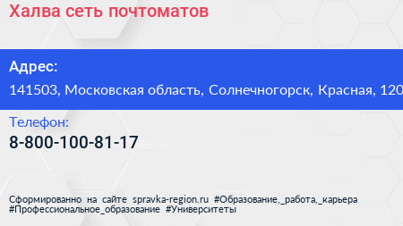 Халва, сеть почтоматов по адресу 141503, Московская область, Солнечногорск, Красная, 120 в дальнейшем Организация, размещена в следующих категориях:
