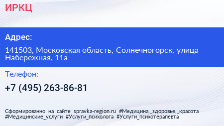 ИРКЦ по адресу 141503, Московская область, Солнечногорск, улица Набережная, 11а в дальнейшем Организация, размещена в следующих категориях: