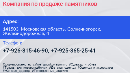 Компания по продаже памятников по адресу 141503, Московская область, Солнечногорск, Железнодорожная, 4 в дальнейшем Организация, размещена в следующих категориях: