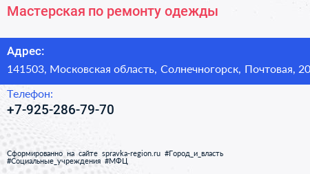 Мастерская по ремонту одежды по адресу 141503, Московская область, Солнечногорск, Почтовая, 20 в дальнейшем Организация, размещена в следующих категориях: