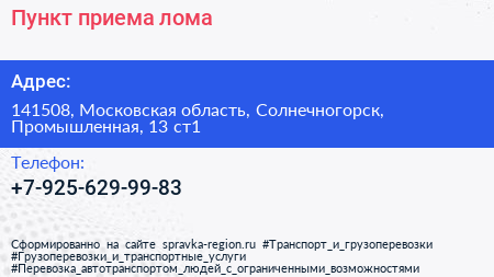 Пункт приема лома по адресу 141508, Московская область, Солнечногорск, Промышленная, 13 ст1 в дальнейшем Организация, размещена в следующих категориях: