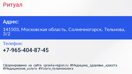 Ритуал по адресу 141503, Московская область, Солнечногорск, Тельнова, 3/2 в дальнейшем Организация, размещена в следующих категориях: