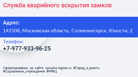 Служба аварийного вскрытия замков по адресу 141508, Московская область, Солнечногорск, Юности, 2 в дальнейшем Организация, размещена в следующих категориях: