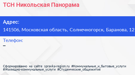 ТСН Никольская Панорама по адресу 141506, Московская область, Солнечногорск, Баранова, 12 в дальнейшем Организация, размещена в следующих категориях: