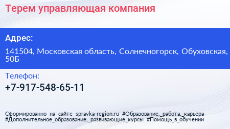 Терем, управляющая компания по адресу 141504, Московская область, Солнечногорск, Обуховская, 50Б в дальнейшем Организация, размещена в следующих категориях: