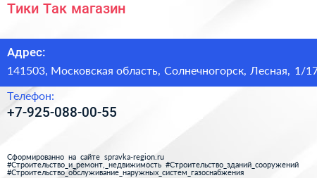 Тики-Так, магазин по адресу 141503, Московская область, Солнечногорск, Лесная, 1/17 в дальнейшем Организация, размещена в следующих категориях: