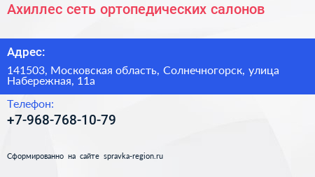 Ахиллес, сеть ортопедических салонов по адресу 141503, Московская область, Солнечногорск, улица Набережная, 11а в дальнейшем Организация, размещена в следующих категориях: