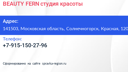BEAUTY FERN, студия красоты по адресу 141503, Московская область, Солнечногорск, Красная, 120 в дальнейшем Организация, размещена в следующих категориях: