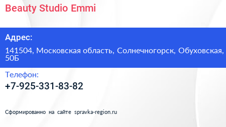 Beauty Studio Emmi по адресу 141504, Московская область, Солнечногорск, Обуховская, 50Б в дальнейшем Организация, размещена в следующих категориях: