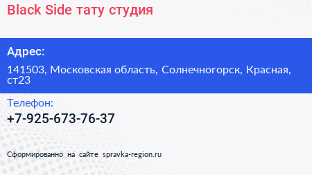 Black Side, тату-студия по адресу 141503, Московская область, Солнечногорск, Красная, ст23 в дальнейшем Организация, размещена в следующих категориях: