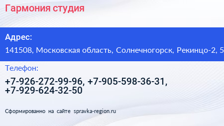 Гармония, студия по адресу 141508, Московская область, Солнечногорск, Рекинцо-2, 5 в дальнейшем Организация, размещена в следующих категориях: