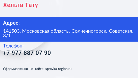 Хельга Тату по адресу 141503, Московская область, Солнечногорск, Советская, 8/1 в дальнейшем Организация, размещена в следующих категориях: