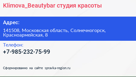 Klimova_Beautybar, студия красоты по адресу 141508, Московская область, Солнечногорск, Красноармейская, 8 в дальнейшем Организация, размещена в следующих категориях: