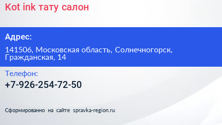 Kot.ink, тату-салон по адресу 141506, Московская область, Солнечногорск, Гражданская, 14 в дальнейшем Организация, размещена в следующих категориях: