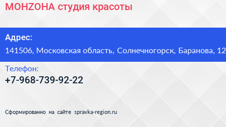 MOHZOHA, студия красоты по адресу 141506, Московская область, Солнечногорск, Баранова, 12 в дальнейшем Организация, размещена в следующих категориях: