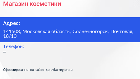Магазин косметики по адресу 141503, Московская область, Солнечногорск, Почтовая, 18/10 в дальнейшем Организация, размещена в следующих категориях: