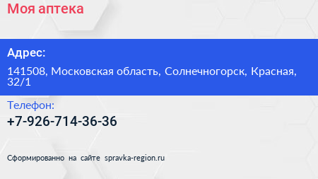 Моя аптека по адресу 141508, Московская область, Солнечногорск, Красная, 32/1 в дальнейшем Организация, размещена в следующих категориях: