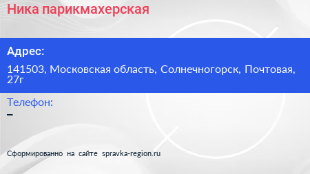 Ника, парикмахерская по адресу 141503, Московская область, Солнечногорск, Почтовая, 27г в дальнейшем Организация, размещена в следующих категориях: