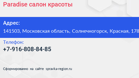 Paradise, салон красоты по адресу 141503, Московская область, Солнечногорск, Красная, 178 в дальнейшем Организация, размещена в следующих категориях: