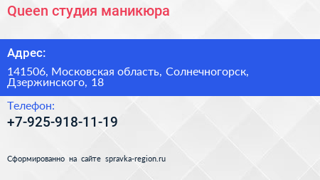 Queen, студия маникюра по адресу 141506, Московская область, Солнечногорск, Дзержинского, 18 в дальнейшем Организация, размещена в следующих категориях: