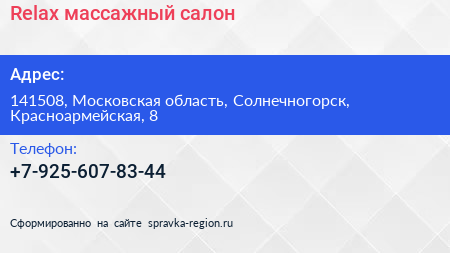 Relax, массажный салон по адресу 141508, Московская область, Солнечногорск, Красноармейская, 8 в дальнейшем Организация, размещена в следующих категориях: