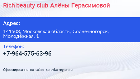 Rich beauty club Алёны Герасимовой по адресу 141503, Московская область, Солнечногорск, Молодёжная, 1 в дальнейшем Организация, размещена в следующих категориях: