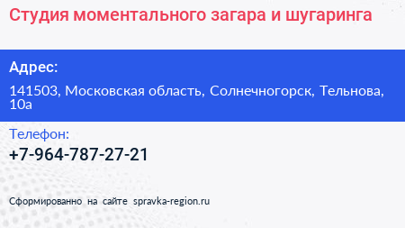 Студия моментального загара и шугаринга по адресу 141503, Московская область, Солнечногорск, Тельнова, 10а в дальнейшем Организация, размещена в следующих категориях: