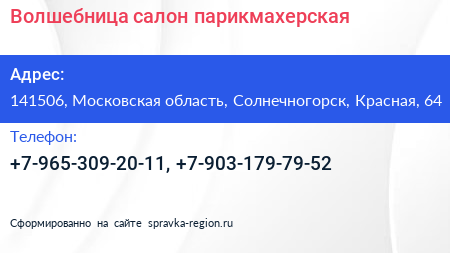 Волшебница, салон-парикмахерская по адресу 141506, Московская область, Солнечногорск, Красная, 64 в дальнейшем Организация, размещена в следующих категориях:
