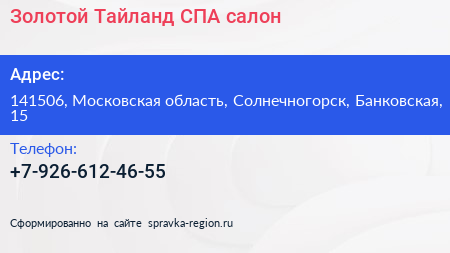 Золотой Тайланд, СПА-салон по адресу 141506, Московская область, Солнечногорск, Банковская, 15 в дальнейшем Организация, размещена в следующих категориях: