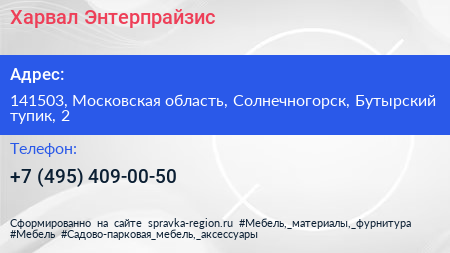 Харвал Энтерпрайзис по адресу 141503, Московская область, Солнечногорск, Бутырский тупик, 2 в дальнейшем Организация, размещена в следующих категориях: