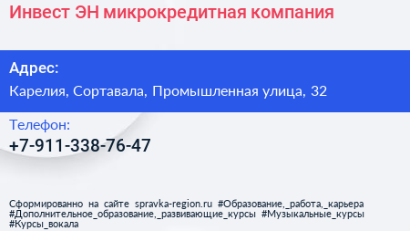 Инвест-ЭН, микрокредитная компания по адресу Карелия, Сортавала, Промышленная улица, 32 в дальнейшем Организация, размещена в следующих категориях: